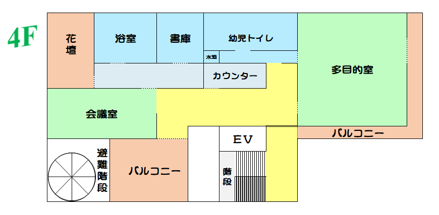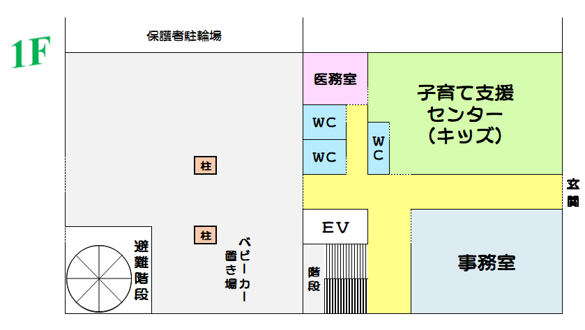 館内図 2025-03-01 00:00 (青字の部分をクリックすると詳細を見ることが出来ます) 子育て支援センター 避難階段 めばえ組 ふたば組 わかば組 あおば組 ちゃお(一時預かり) しげり・みのり組 図書室 給食室 テラス 多目的室 バルコニー 屋上(プール・砂場・畑)
